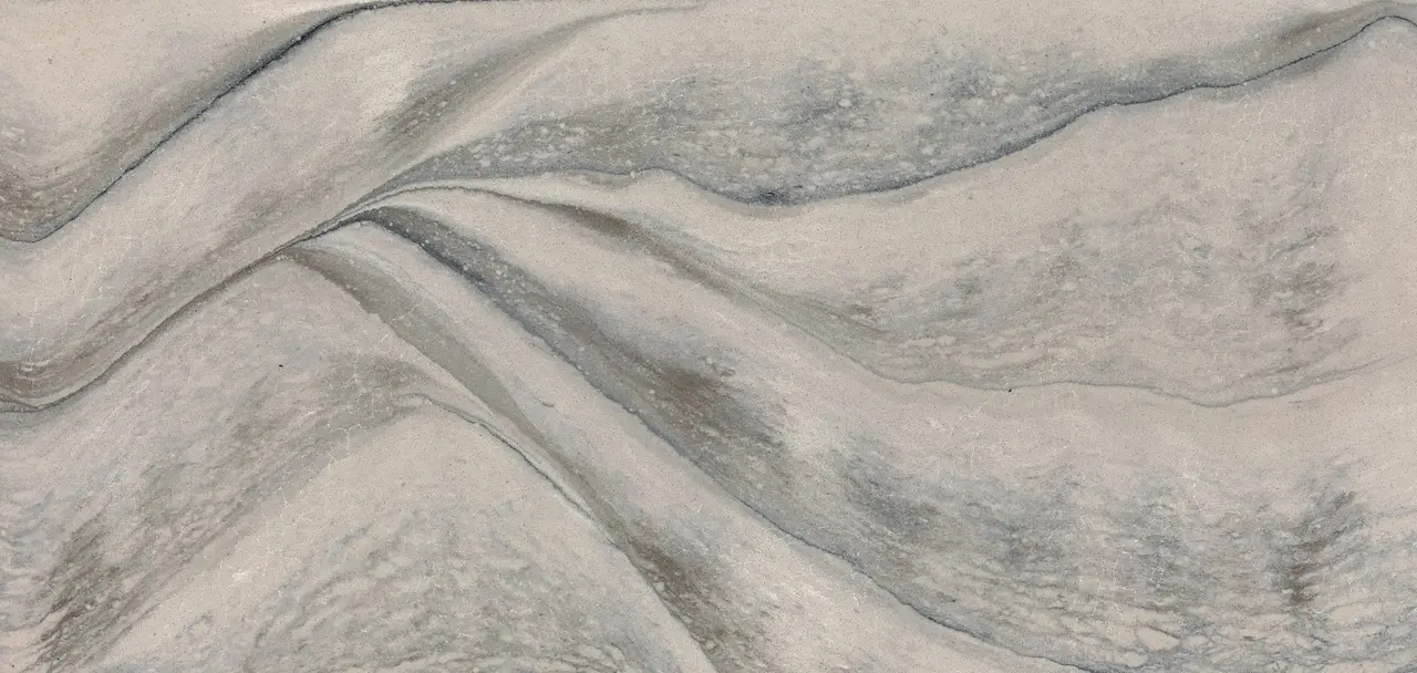 A blend of warm, cool grays and tones of taupe mix with delicate, white crackling veins and shades of blue that melt into the surface.